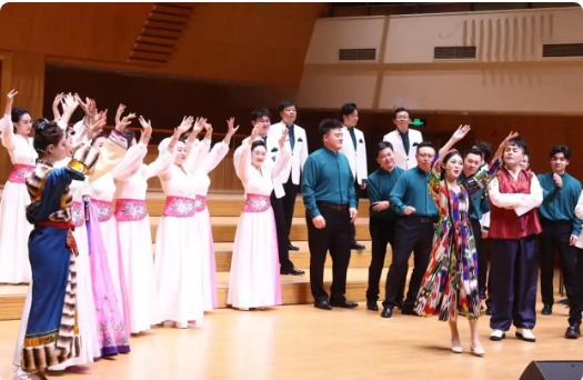 北京日报客户端记者 方非摄《跟着民歌去旅行》之所以能调动人的情绪,除了编配好听的音乐之外,还在于加入部分情境式表演。歌唱家和合唱队成员并非一板一眼在舞台上“站桩”演唱,他们甚至不会像传统音乐会在曲目开始前入场,在这场音乐会中,上下场的时间由歌曲的情境决定。随着音乐故事的推进,合唱队员且歌且舞,让音乐厅现场有如一场盛大的狂欢,台下的观众仿佛坐在篝火旁,看自己的亲友歌唱舞蹈。青年指挥家王冠人更是“入戏”,不时模仿一下歌唱家或演奏家的动作,沉浸在音乐中的状态也让观众很有代入感。