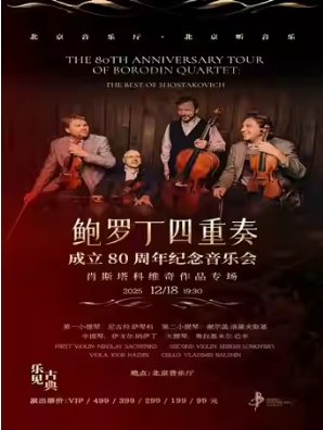 “乐见古典”·鲍罗丁四重奏成立80周年纪念音乐会——肖斯塔科维奇作品专场 时间:2025.12.18 周四 19:30 场馆:北京市 | 北京音乐厅 票价:99/199/299/399/499 订票电话:010-66552100,010-66552258 微信订票:18515362586